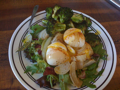 Here we have a bed of mixed-baby greens, some leftover roasted onions (w/ bacon fat) from last night, the roasted broccoli florets on top. I sprinkled some classic blend of cajun seasoning on top of each egg and then cut them to make sure they weren't over cooked. Topped with some salt, pepper, balsamic and red wine vinegar. Really easy and tasty- an accidentally vegetarian and substantial salad that even a carnivore can enjoy.